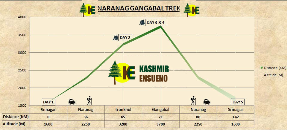 The Narang-Gangabal-Trek expedition is the only trek in Kashmir which remains open most of the year. The trek is considered as an easy trek, owing to the well established path and the altitude which remains under 3700m asl. The trek passes through pine forests, meadows and reaches its destination at the twin alpine lakes (Gangabal and Nundkol Lake) situated at the foothills of mount Haramukh (5300M).