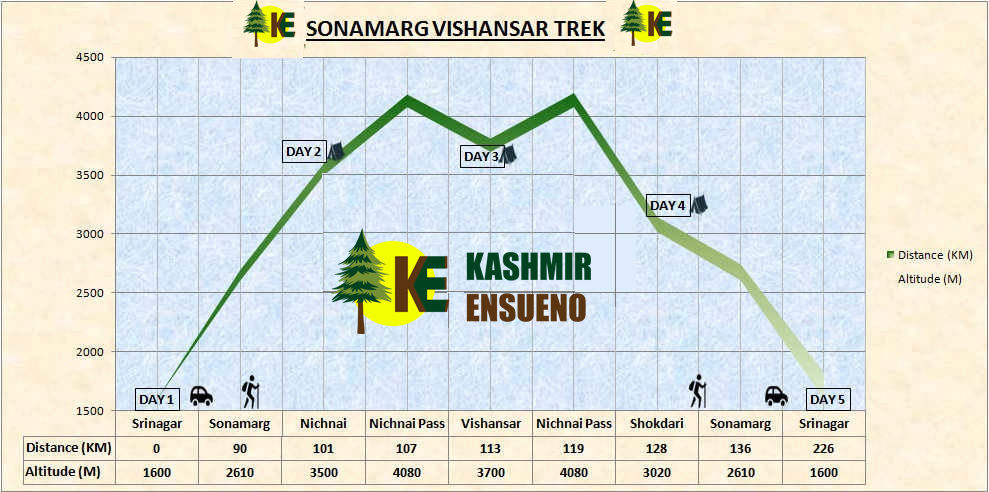 The Sonamarg-Vishansr-Trek expedition is a part and the first leg of the Kashmir Great Lakes Trek. The trek passes through pine and birch forests of Shokdari and meadows of Nichnai. The highest point of the trek is Nichnai Pass (4100M) which is crossed to reach the destination at the trek at the twin alpine lakes of Vishansar and Krishansar.