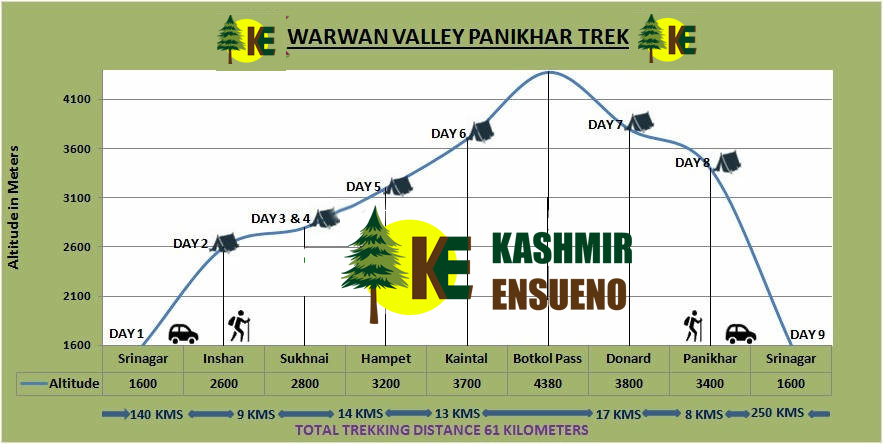 Warwan Valley – Panikhar trek is a high altitude alpine trekking trail of about 92kms. It starts at Mungli, reaches the highest point at Bhatkol Pass (4390M), and concludes at Panikhar village of Kargil. The trek is full of extensive mountain walking with some steep climbs and sharp descends. Overall the trekking trip is not considered as difficult but of moderate level, though it can be quite physically demanding for which proper fitness is absolutely necessary. This trekking trip can be done by first-time trekkers too and no previous experience in the field is necessary. Warwan valley trek is not only a pleasure for the adventure seekers but it is an ideal expedition for the nature lovers too who finds it a privilege to bask in the undisturbed beauties of nature in a remote yet most beautiful valley of Warwan.